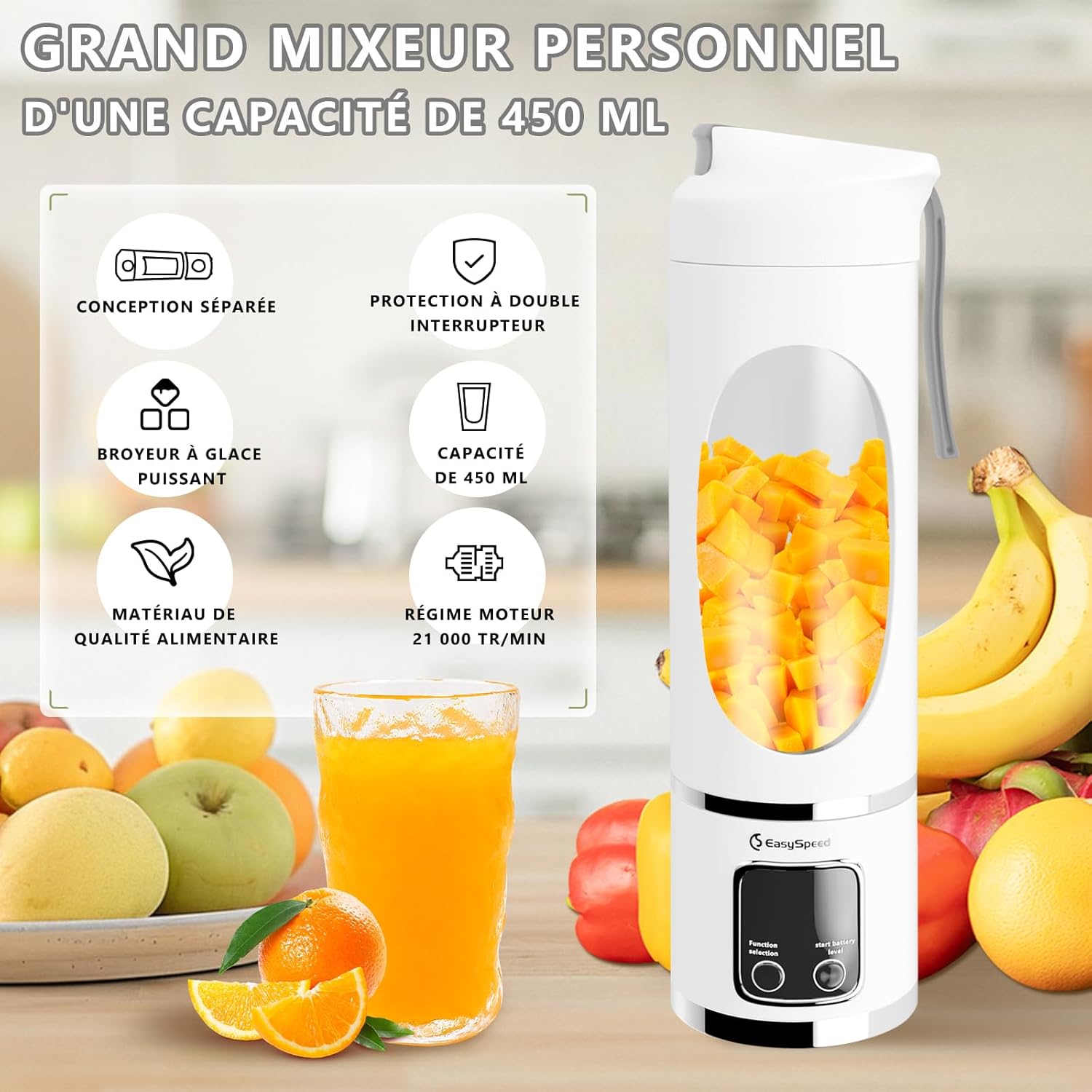 j'ai acheté ce mini blender pour faire un smoothie rapide le matin et franchement je suis pas déçue il est vraiment pratique je le recharge une fois par semaine et ca suffit en plus il est super compact je le mets direct dans mon sac sans qu'il prenne de place
